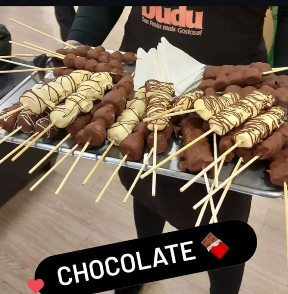ESPETINHOS DOCES : 3 UNIDADES DE ESPETINHOS DOCES POR CONVIDADO ( MORANGO, BANANA, UVA E MARSHMALLOW).SELECIONADAS E COBERTOS COM CHOCOLATE DE ALTA QUALIDADE.